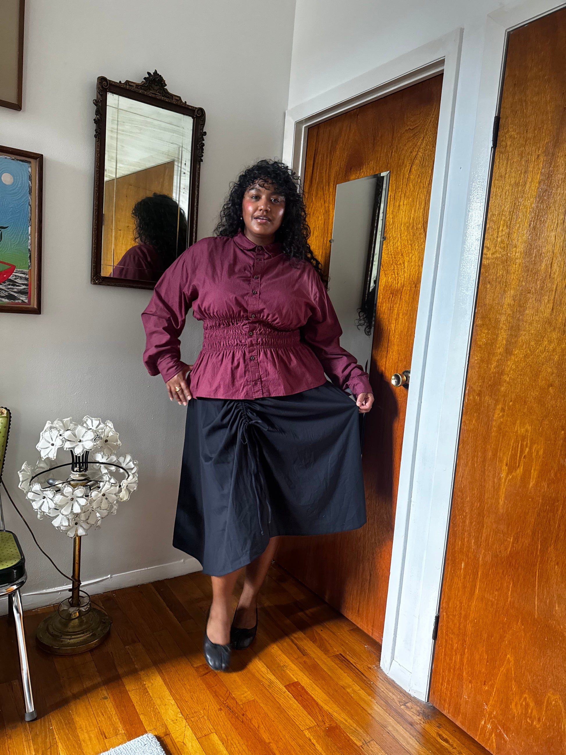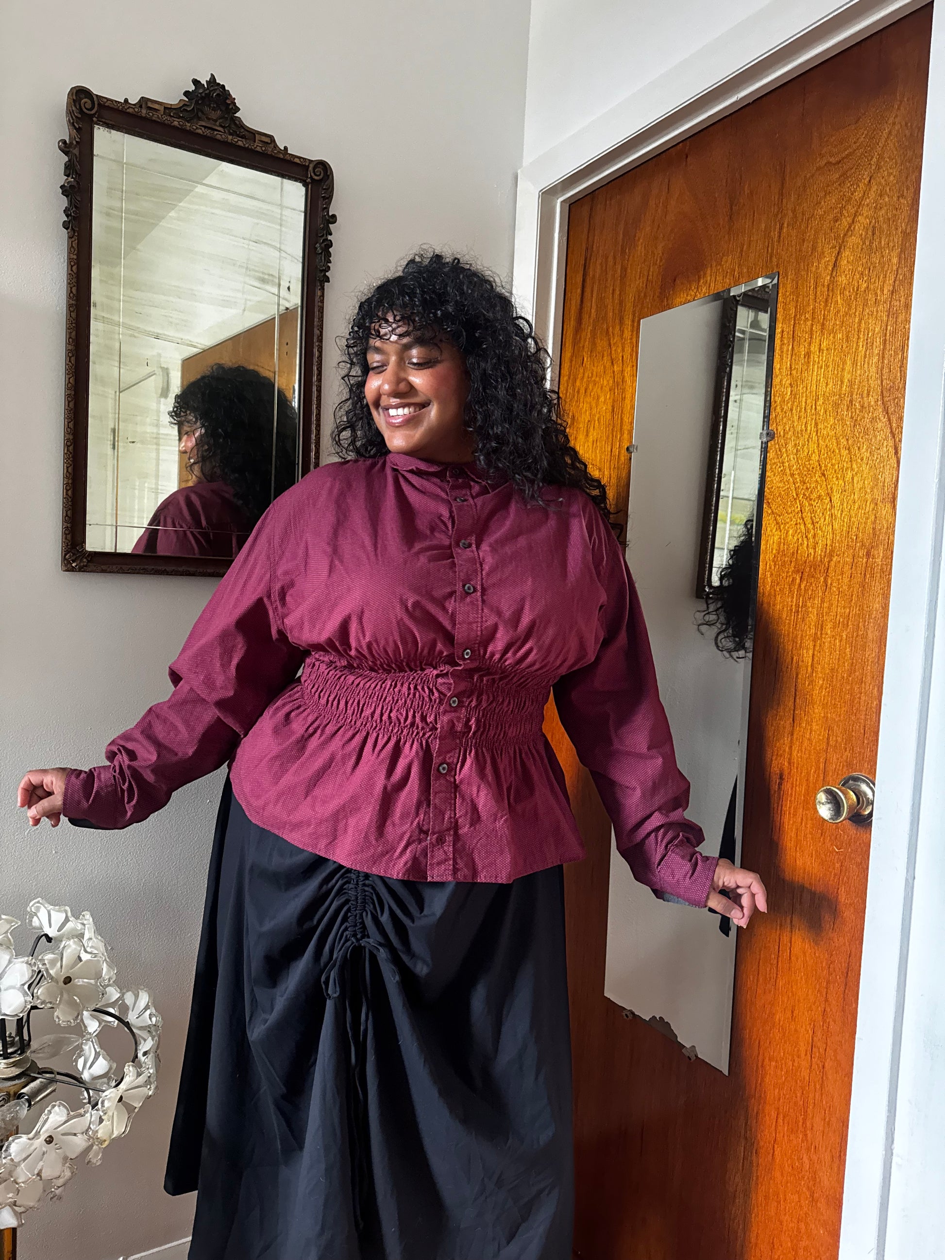 The Marielle Top is a one-of-a-kind piece made from a men’s button-up. It has a ruched waist for a snatched fit and oversized sleeves.
